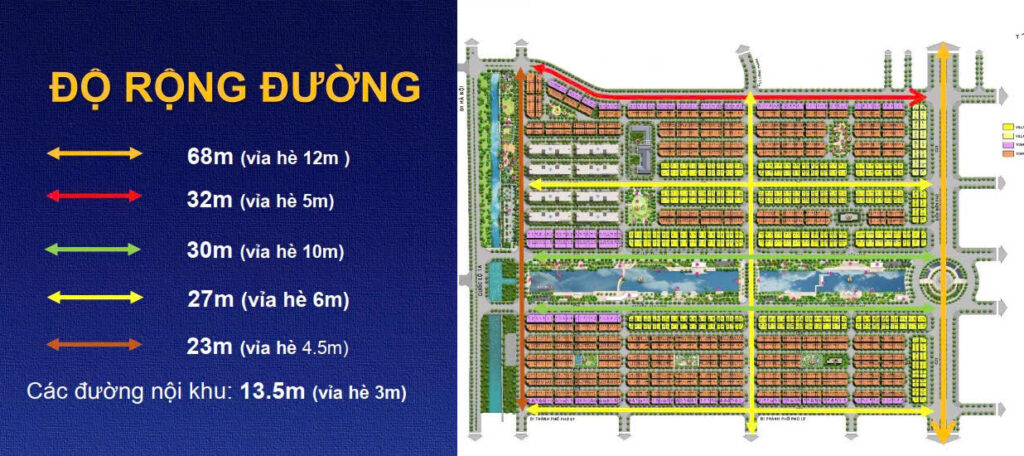 Sun Urban City sở hữu mạng lưới giao thông nội khu hiện đại với các tuyến đường đa dạng, từ đường rộng 13.5m (vỉa hè 3m mỗi bên) đến các trục đường lớn 27m và 68m (vỉa hè 6-12m), đảm bảo sự thông thoáng và thuận tiện di chuyển. Nổi bật là đại lộ Nguyễn Văn Linh – trục công viên lễ hội rộng 30m với vỉa hè xanh mát lên đến 10m, tạo nên không gian sống văn minh và kết nối tối ưu. Đây chính là nền tảng hạ tầng lý tưởng, góp phần nâng tầm giá trị của toàn khu đô thị.